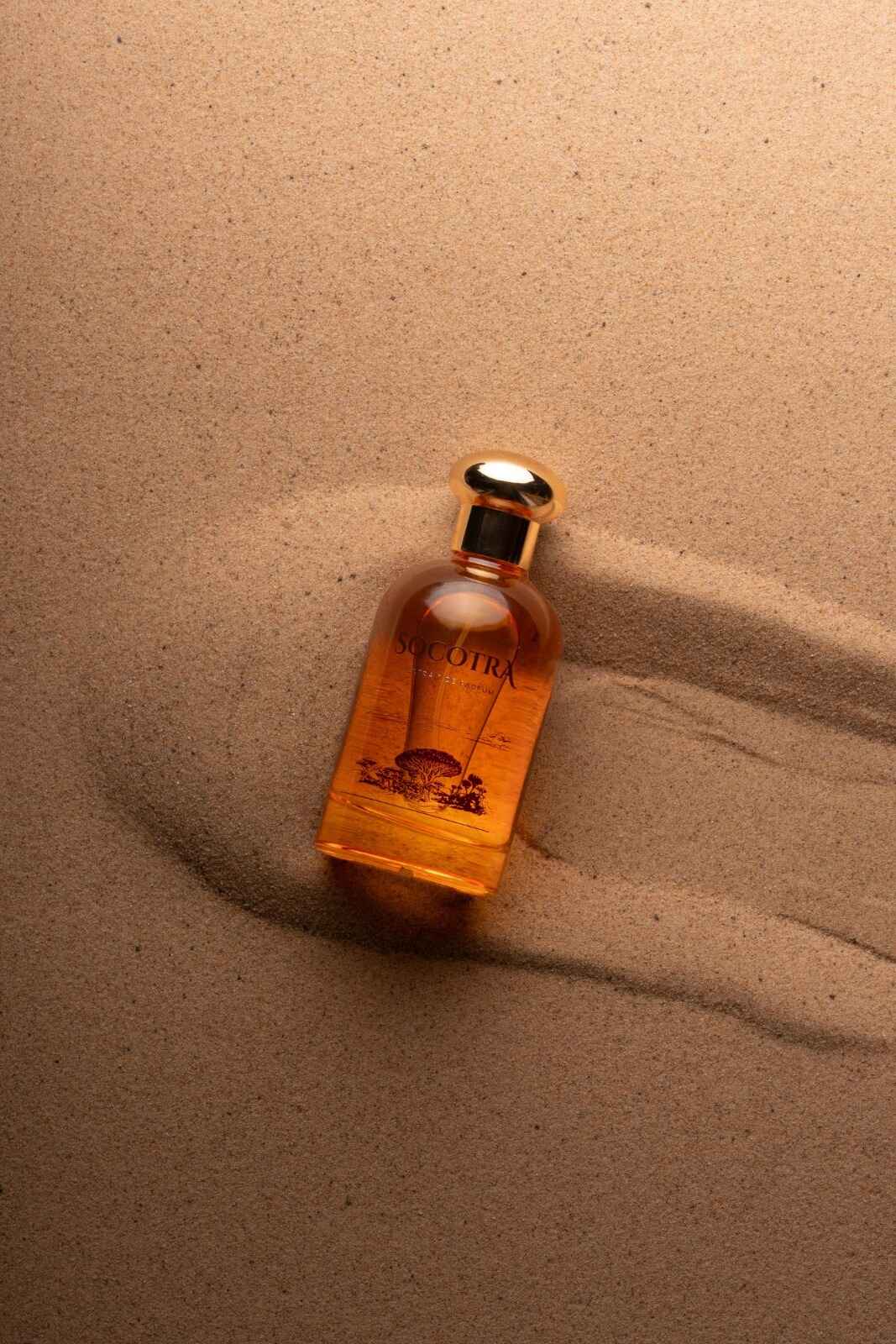 The design on the perfume bottle reflects Socotra Island in Yemen, one of the most biodiverse and distinct islands in the world. The golden cap is crafted from zamac, giving it a luxurious appearance, substantial weight, and a rich touch.