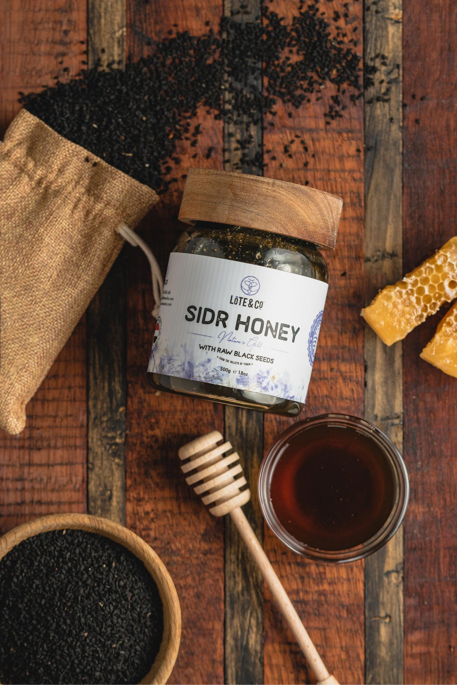 Yemeni Sidr Honey from the vast Tihama valleys of the Arabian Peninsula infused with raw nigella (black) seeds - Both honey and black seed have antibacterial, anti-inflammatory, and anti-cancer properties and provide a distinctive taste.